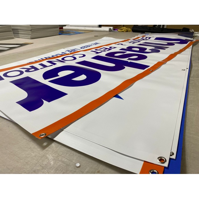 We use a premium heavyweight 13 oz. scrim vinyl banner. It has a very smooth surface for best printing results. This material is typically used for billboards, building wraps, banners, event flags, trade show signage, parades, etc.